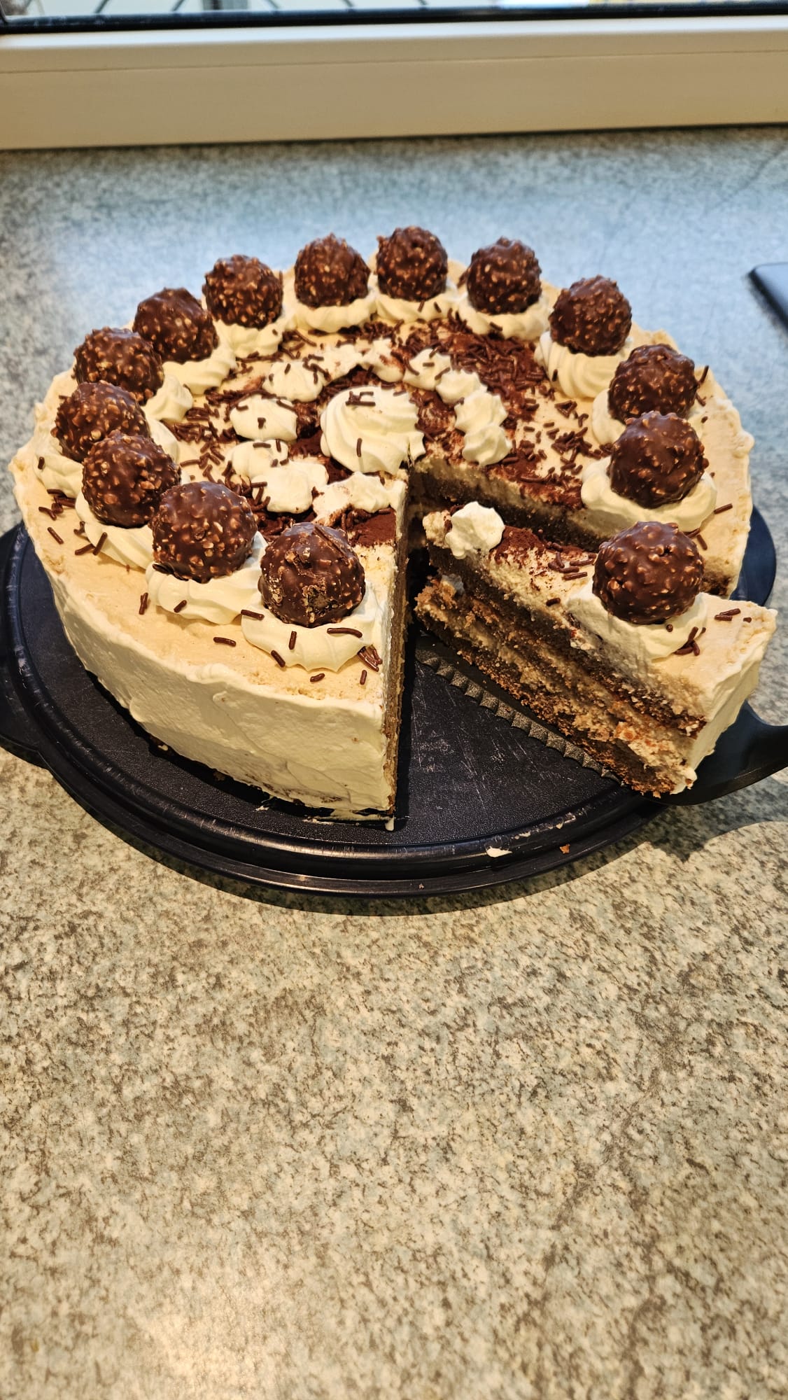 Den Boden 2 x durchschneiden und mit der Creme füllen. Über Nacht ruhen lassen und verzieren.